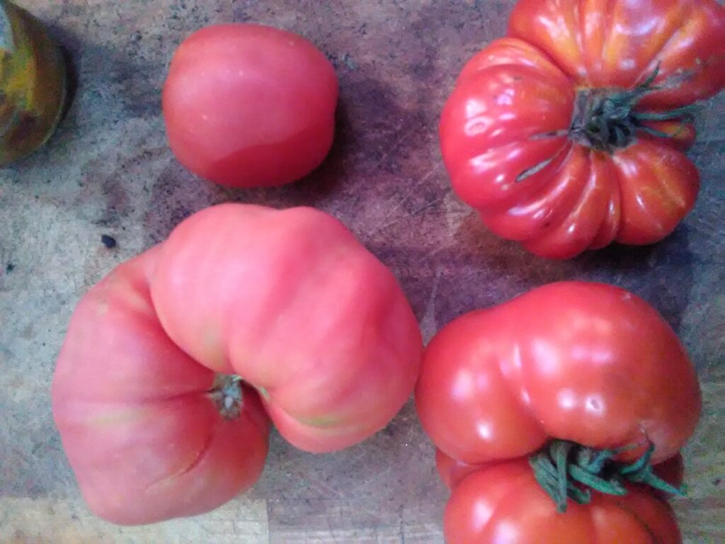 The Here we have a hybrid tomato that bred itself! Many plants cross-pollenate, but tomatoes are generally self-pollenating. This means the flower pollenates itself, and so breeding one type of tomato with another usually requires some effort. Not in this case! The top left is a “Peche Vilmorin De Andrieux”, stuffing tomato. The top and bottom right, is a “Marmande” beefsteak. What we have on the bottom left, is a hybrid of the two! So it is a new peach coloured, beefsteak tomato, and this means – we get to name it! I am collating answers as we speak so please send your ideas in by email to grassrootsgarden@protonmail.com.