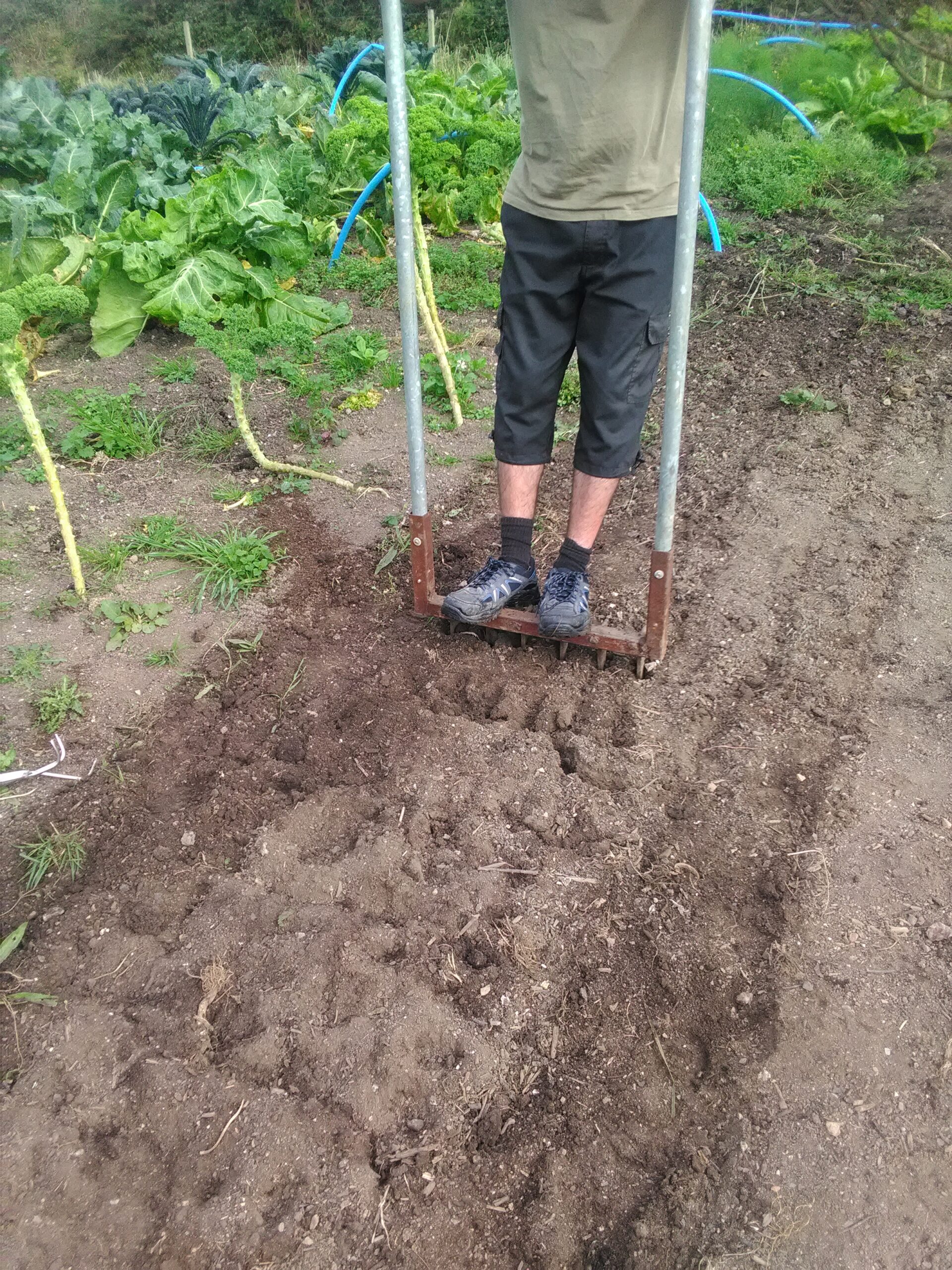 This is Dave, who is using a tool I made quite a while ago. It’s called a Broadfork, and is basically just a broad fork, with long tines, and 2 really long handles. I added wooden handles initially but they broke within the first few minutes, so now it weighs a tonne due to the metal handles (which used to be a hand rail).