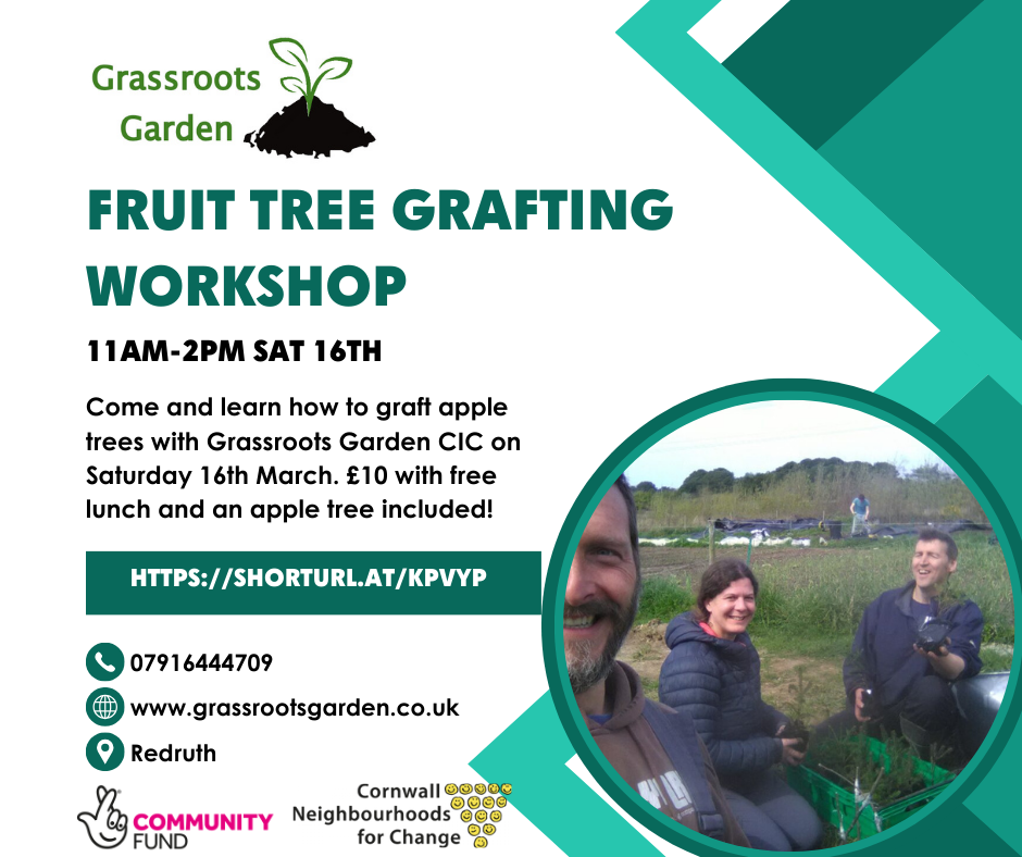We want to use this new space to run our first workshop this weekend, on fruit tree grafting. Come and join us if you want to learn how to graft fruit trees, for just £10. We will provide lunch (veg stew), and give you a grafted apple tree to take home with you!