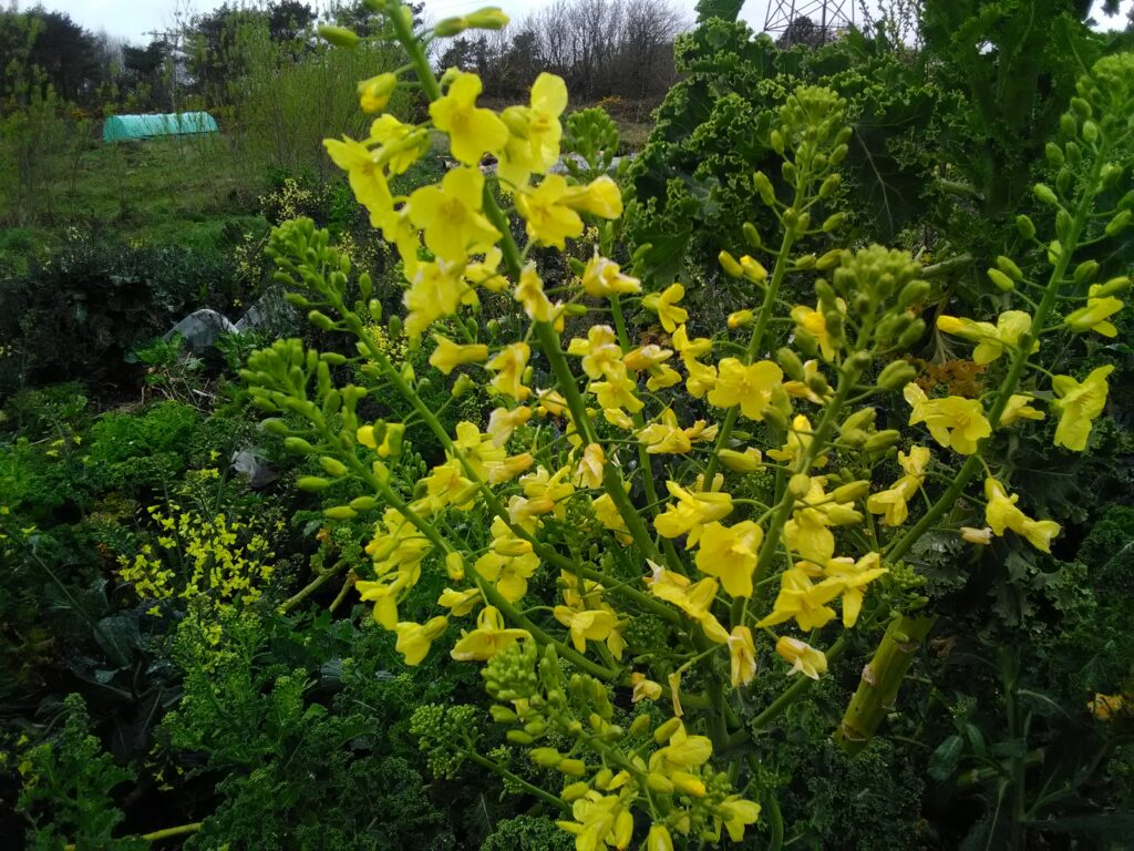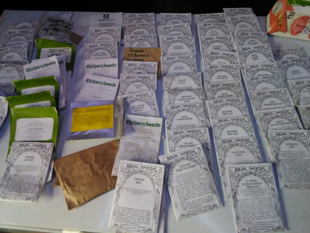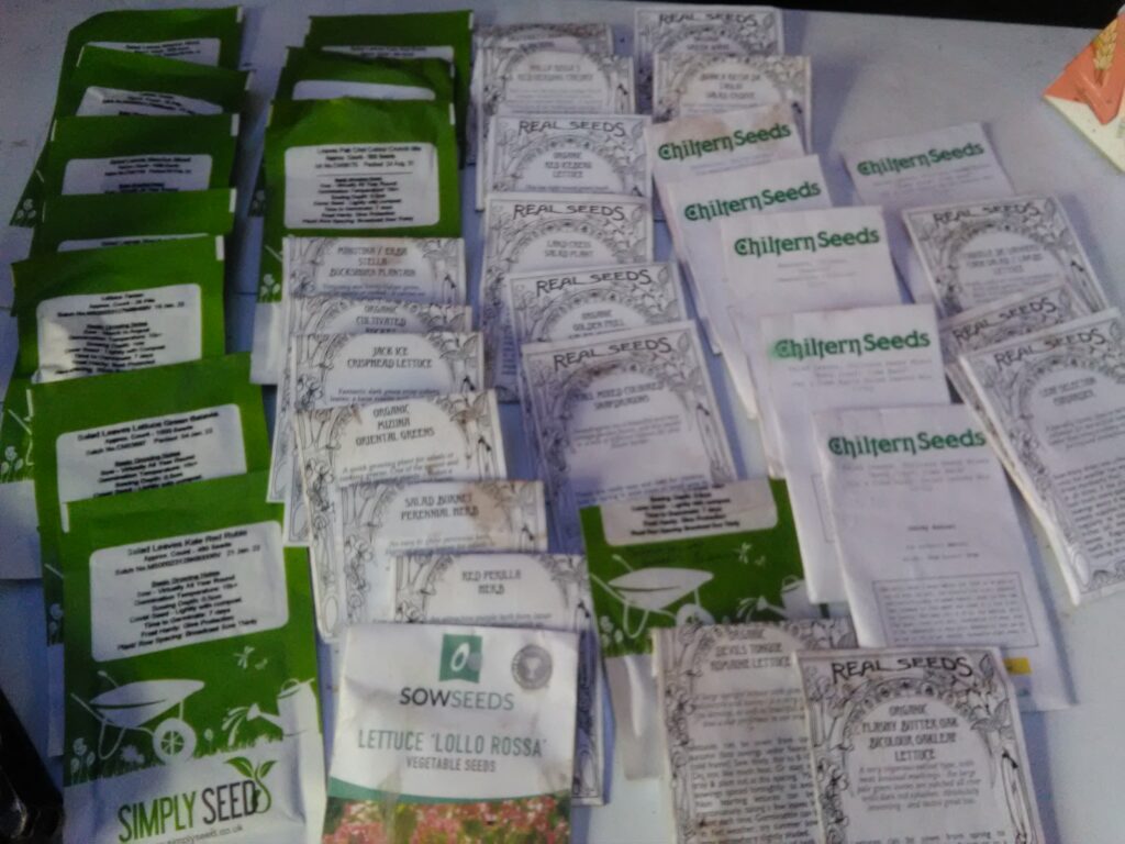 So far, if you’re curious, we have planted (from the top of my head) aubergene, many different speciality carrots, 2 varieties of cucumbers, lots of chicory, green and brown (used for dhal) peas, several different beans, a few types of beetroot, turnips, spinach, chard, 4 types of kale, kohl rabi (if you haven’t tried this, you’re in for a treat), endive, so many colours and flavours of lettuce, 3 types of tomato, edible flowers for the salad mix, 3 types of garlic, 3 types of broccoli, leeks, spring onions, radish, asparagus, and probably many more that I’ve missed. We still have so many favourites to plant in the next few weeks, like sweetcorn, courgettes, and a dizzying array of salad leaves and flowers! I’ll add pics of the seed packets we have left after our recent flurry of planting – quite a selection! I felt the need to stock up after the seed shortages in the last couple of years, just in case. We are using heritage varieties, and will save an increasing amount of our own seed as time goes on.